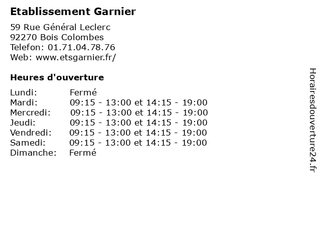 1 Etablissements Garnier (Distance: 0,00 km) 59 Rue du Général Leclerc, 92270 Bois-Colombes etablissements, garnier 2 Garnier Adrien (Distance: 0,49 km) 41 Rue Jean Jaures, 92270 Bois Colombes adrien, garnier, restaurants 3 Etablissement Huang-Dubois (Distance: 0,51 km) 69 Rue Des Bourguignons, 92270 Bois Colombes dubois, etablissement, huang, restaurants 4 Etablissement Leclerc (Distance: 0,67 km) 80 Avenue Chevreul, 92600 Asnières-sur-Seine etablissement, leclerc 5 Etablissement Francais Du Sang (Distance: 3,01 km) 100 bld du Général Leclerc, 92110 Clichy blood donations, du, etablissement, francais, hospital, medical, office, practical advice, sang 6 Etablissement Francais Du Sang (Distance: 5,06 km) 46 rue Henri Huchard, 75018 Paris blood donations, du, etablissement, francais, hospital, medical, office, practical advice, sang |