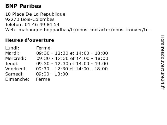 1 BNP Paribas (Distance: 0,79 km) 8 Place de la Gare des Vallées, 92250 La Garenne-Colombes argent, banque, bnp, lep, livret, paribas, placement, retrait 2 BNP Paribas (Distance: 0,85 km) 8 rue de Lorraine, 92600 Asnières-sur-Seine argent, banque, bnp, lep, livret, paribas, placement, retrait 3 BNP Paribas (Distance: 1,10 km) 196 boulevard Voltaire, 92600 Asnières-sur-Seine banques, bnp, commerciales, livret, nationales, paribas, épargne 4 BNP Paribas (Distance: 1,29 km) 6 place de Belgique, 92400 Courbevoie argent, banque, bnp, lep, livret, paribas, placement, retrait 5 BNP Paribas (Distance: 2,24 km) 187 Avenue Gabriel Péri, 92230 Gennevilliers argent, banque, bnp, lep, livret, paribas, placement, retrait 6 BNP Paribas (Distance: 3,35 km) 102 Avenue Achille Peretti, 92200 Neuilly-sur-Seine agence, argent, assurance, bancaire, banque, bnp, depot, paribas, transfert  |