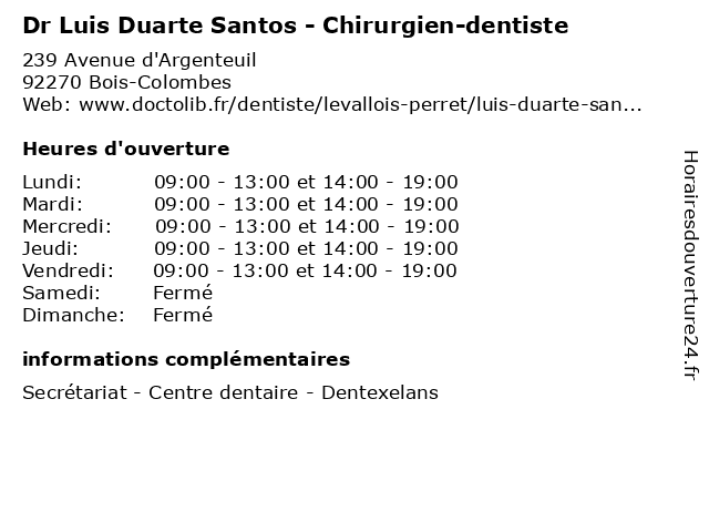 1 Dr Luis Duarte Santos - Chirurgien-dentiste (Distance: 3,28 km) 54 Rue Carnot, 92300 Levallois-Perret chirurgien, dentiste, dr, duarte, luis, médecin, médecine, médical, pharmaceutique, santos, secrétariat, traitement 2 Dr Andreia Duarte - Chirurgien-dentiste (Distance: 0,00 km) 239 Avenue d'Argenteuil, 92270 Bois-Colombes andreia, chirurgien, consultation, dentiste, docteur, dr, duarte, med, médecin, traitement 3 Costa Jose Luis (Distance: 2,57 km) 145 Rue d Estienne d Orves, 92700 Colombes costa, jose, luis, restaurants 4 Maître Patricia Dos Santos - Avocate (Distance: 3,82 km) 61 Rue de Villiers, 92200 Neuilly-sur-Seine avocate, avocats, civils, dos, droits, juridiques, maître, patricia, santos 5 Dos Santos Jose Luis (Distance: 4,67 km) 44 Rue Guy Moquet, 75017 Paris dos, jose, luis, restaurants, santos 6 |