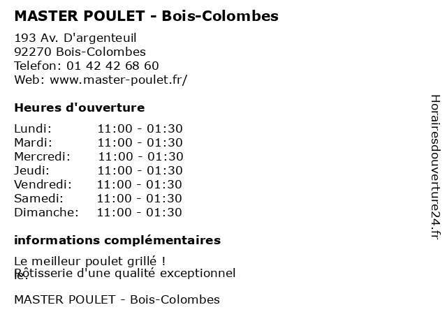 Termes de recherche pour MASTER POULET - Bois-Colombes:bois, colombes, restaurants, master, fast-food, poulet, service de livraison de restaurant, restaurant de grillades |