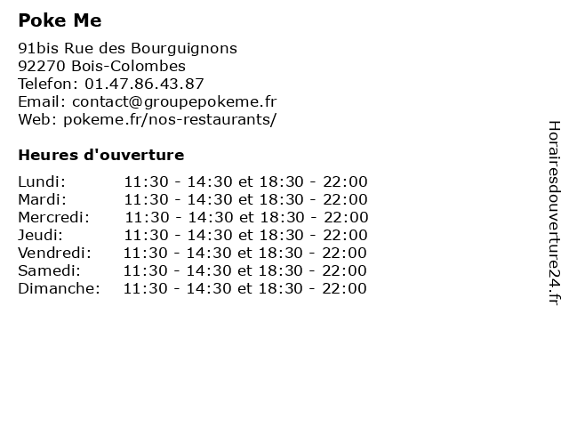 1 Poke Me (Distance: 3,62 km) 80 avenue des Ternes, 75017 Paris bowl, hawaien, me, poke, poké, restaurant 3 Poke Me (Distance: 8,91 km) 26 avenue du Général Leclerc, 92100 Boulogne-Billancourt bowl, hawaien, me, poke, poké, restaurant 4 Poke Me (Distance: 9,09 km) 90 boulevard Richard Lenoir, 75011 Paris bowl, hawaien, me, poke, poké, restaurant 5 6 Poke Me (Distance: 9,41 km) 58 Rue Monge, 75005 Paris cuisine, me, menus, poissons, poke, repas, restaurants |