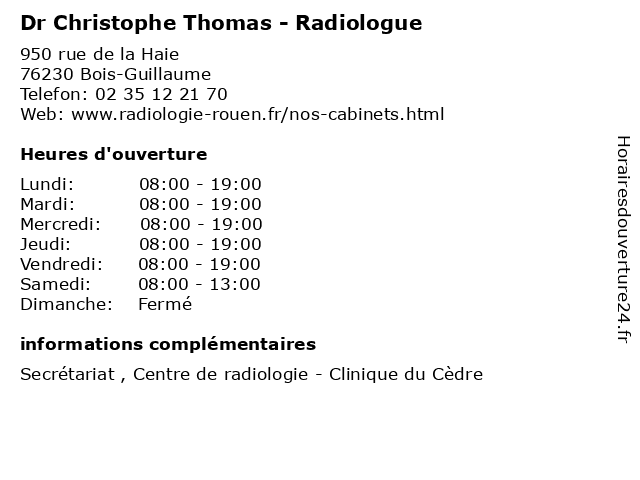 1 Dr Christophe Thomas - Radiologue (Distance: 2,37 km) 98 Rue Louis Pasteur, 76130 Mont-Saint-Aignan christophe, consultation, docteur, dr, med, médecin, médecine, radiologue, thomas, traitement 2 Dr Christophe Thomas - Radiologue (Distance: 6,35 km) 9 rue d’Anjou, 76240 Le Mesnil-Esnard christophe, consultation, docteur, dr, med, médecin, médecine, radiologue, thomas, traitement 3 Dr Jean-Christophe Boyer - Radiologue (Distance: 0,00 km) 950 rue de la Haie, 76230 Bois-Guillaume boyer, christophe, consultation, docteur, dr, jean, med, médecin, médecine, radiologue, traitement 4 Dr Van Der Linden Thomas - Médecin anesthésiste réanimateur (Distance: 0,03 km) 950 Rue de la haie, 76230 Bois Guillaume anesthésiste, bois guillaume, der, docteur, dr, linden, médecin, médecin anesthésiste, réanimateur, thomas, van 5 Medecin Thomas Defines (Chirurgien orthopédiste et traumatologue) (Distance: 0,77 km) 696 Rue Robert Pinchon, 76230 Bois-Guillaume chirurgien, defines, docteur, et, medecin, orthopédiste, sante, services, thomas, traumatologue 6 Ecole Maternelle Publique Thomas Corneille (Distance: 2,48 km) 214 Route de Darnetal, 76000 Rouen corneille, cours, ecole, education, maternelle, publique, services, thomas, école |