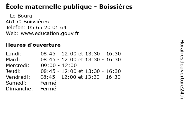 | Lundi | 08:45-12:00 et 13:30-16:30 |