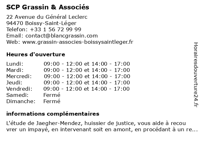 1 SCP X. Blanc M. Grassin Huissier boissy Saint Léger (Distance: 0,01 km) 22 Avenue du Général Leclerc, 94470 Boissy-Saint-Léger blanc, boissy, grassin, huissier, léger, m., saint, scp, x. 2 SCP DE CHIRURGIENS DENTISTES GIUNTA (Distance: 0,42 km) 12 Rue Louise Chenu, 94470 Boissy Saint Léger chirurgiens, de, dentistes, giunta, scp 3 Scp Kerneur - Huissiers de Justice associés (Distance: 6,02 km) 13 Avenue Foch, 94100 Saint-Maur-des-Fossés associés, de, huissiers, justice, kerneur, saint-maur-des-fossés, scp 4 SCP Lefeuvre Marc Tournier Devidal (Distance: 6,07 km) 12 Avenue Emile Zola, 94100 Saint-Maur-des-Fossés devidal, lefeuvre, marc, scp, tournier 5 Dr Paul Blanc-Durand - Médecin nucléaire (Distance: 6,41 km) 51 Avenue du Maréchal de Lattre de Tassigny, 94000 Créteil blanc, consultation, docteur, dr, durand, med, medecine, medical, médecin, nucléaire, paul, traitement 6 Cordon Blanc Receptions (Distance: 7,66 km) 14 Rue Du Docteur Roux, 94600 Choisy Le Roi blanc, cordon, receptions, restaurants |