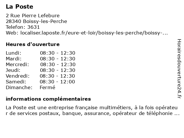 1 La Poste (Distance: 7,79 km) - Place Marche, 27820 Chennebrun express chronopost, la, poste, réexpédition internationale 2 La Poste (Distance: 8,22 km) 29 Rue de Laborde, 28340 La Ferté-Vidame agence postale, courrier postal, expédition internationale, la, poste 3 La Poste (Distance: 10,65 km) 3 Rue de Brest, 61190 Saint-Maurice-lès-Charencey agence, assurance, banque, banque postale, bureau de poste, chronopost, colis, courrier, dps, expéditions internationales, la, point, postale, poste, relais, timbres, téléphonie, ups, western union 4 La Poste (Distance: 11,20 km) 10 rue des 4 Cantons, 27580 Bourth express chronopost, la, poste, réexpédition internationale 5 La Poste (Distance: 12,94 km) - Route de Paris, 61300 Saint-Sulpice-sur-Risle agence, assurance, banque, banque postale, bureau de poste, chronopost, colis, courrier, dps, expéditions internationales, la, point, postale, poste, relais, timbres, téléphonie, ups, western union 6 La Poste (Distance: 13,42 km) 52 route de Paris, 61300 Chandai express chronopost, la, poste, réexpédition internationale |