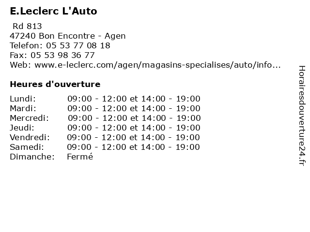 1 E.Leclerc Location (Distance: 3,32 km) - Rd 813, 47240 Bon Encontre auto, e.leclerc, fourgon, location, voiture 2 E.Leclerc Auto (Distance: 3,32 km) - Route Nationale 113, 47240 Bon Encontre auto, e.leclerc, l'auto, service, services, services a la personne 3 E.Leclerc Manège A Bijoux (Distance: 3,32 km) - Route départementale 813, 47240 Bon Encontre bijoutier, bijoux, création de bijoux, e.leclerc, magasin de montres, manège, réparation de montres 4 E.Leclerc Agen (Distance: 3,32 km) Route departementale 813, 47240 Bon Encontre agen, courses, e.leclerc, supermarchés 5 E.Leclerc Station Service (Distance: 3,32 km) - Route départementale 813, 47240 Bon Encontre e.leclerc, fournisseur de gaz, fournisseur de gaz propane, service, station 6 E.Leclerc Drive (Distance: 3,32 km) . Route départementale 113, 47240 Bon Encontre drive, e.leclerc, service, services, services a la personne |