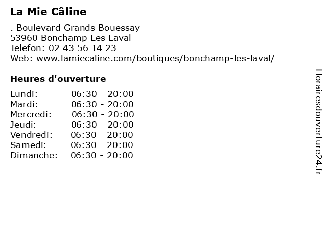 1 La Mie Câline (Distance: 3,35 km) 7 Place du 11 Novembre, 53000 Laval boissons, confiseries, câline, la, mie, pains, plats chauds, salades, sandwichs, traiteur 2 Les Comptoirs d'Alice (Distance: 5,93 km) 23 Boulevard Louis Armand, 53940 Saint-Berthevin bar à salades, comptoirs, d'alice, les, restaurant de cuisine maison, restaurant familial, restaurant français, restaurant-buffet 3 La Mie Câline (Distance: 27,10 km) 15 Place Georges Clémenceau, 53100 Mayenne boissons, confiseries, câline, la, mie, pains, plats chauds, salades, sandwichs, traiteur 4 La Mie Câline (Distance: 27,20 km) 13 Place de la République, 53200 Château-Gontier boissons, confiseries, câline, la, mie, pains, plats chauds, salades, sandwichs, traiteur 5 Brioche Dorée (Distance: 27,57 km) - Route Nationale 157, 35370 Mondevert boulangerie, brioche, dorée, fast food, pains, patisseries, restaurant, restauration rapide 6 Brioche Dorée (Distance: 29,62 km) 8 aire d'Erbrée, 35500 Erbrée boulangerie, brioche, dorée, fast food, pains, patisseries, restaurant, restauration rapide |