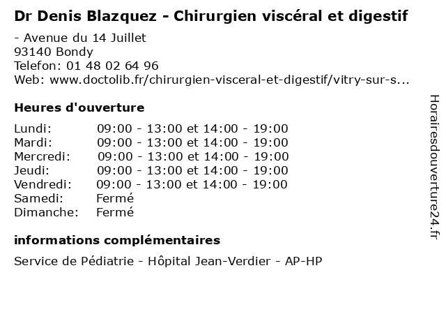 1 Dr Denis Blazquez - Chirurgien viscéral et digestif (Distance: 15,31 km) 30 Rue Audran 94400, 94400 Vitry-sur-Seine blazquez, chirurgie, chirurgien, denis, digestif, dr, et, general, soins, viscéral 2 Dr Giulia Boarini - Chirurgien viscéral et digestif (Distance: 0,21 km) - Avenue du 14 Juillet, 93140 Bondy boarini, chirurgien, digestif, dr, et, giulia, médecins, médicaments, santé, secrétariat, spécialiste, viscéral 3 Dr Corinne Vons - Chirurgien viscéral et digestif (Distance: 0,21 km) - Avenue du 14 Juillet, 93140 Bondy chirurgien, corinne, digestif, dr, et, médecins, médicaments, santé, secrétariat, spécialiste, viscéral, vons 4 Dr Alcide Philippe Thognon - Chirurgien viscéral et digestif (Distance: 1,84 km) 135 Avenue Vauban, 93190 Livry-Gargan alcide, chirurgien, consultation, digestif, docteur, dr, et, med, médecin, médecine, philippe, secrétariat, thognon, traitement, viscéral 5 Hôpital Jean-Verdier - Hôpitaux Universitaires Paris Seine-Saint-Denis - AP-HP (Bondy) (Distance: 1,94 km) . Avenue du 14 Juillet, 93143 Bondy ap, bondy, denis, docteur, hp, hôpital, hôpitaux, jean, medecins, paris, saint, sante, seine, universitaires, verdier 6 Service départemental des impôts foncier (SDIF) Seine-Saint-Denis (Distance: 2,76 km) 15-17 Promenade Jean-Rostand, 93000 Bobigny administration, assoc, centre, denis, des, départemental, foncier, impôts, saint, sdif, seine, service, services, services publics |