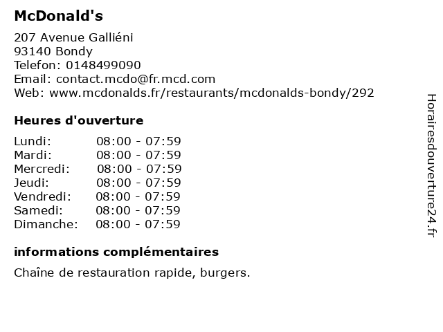 1 McDonald's (Distance: 2,05 km) 2 Boulevard De La République, 93190 Livry-Gargan burgers, fast, food, hamburgers, mcdonald's, rapide, restaurant, restauration 2 McDonald's (Distance: 3,75 km) 82/90 Rue Vaillant Couturier, 93130 Noisy-le-Sec burgers, fast, food, hamburgers, mcdonald's, rapide, restaurant, restauration 3 McDonald's (Distance: 8,84 km) 47-51 Avenue de Stalingrad, 95140 Garges-lès-Gonesse burgers, fast, food, hamburgers, mcdonald's, rapide, restaurant, restauration 4 McDonald's (Distance: 9,06 km) - Rue Gabriel De Mortillet, 77500 Chelles burgers, fast, food, hamburgers, mcdonald's, rapide, restaurant, restauration 5 McDonald's (Distance: 10,80 km) 6 Avenue Jean Monnet, 77270 Villeparisis burgers, fast, food, hamburgers, mcdonald's, rapide, restaurant, restauration 6 McDonald's (Distance: 13,47 km) - Centre Commercial Carrefour, 77410 Claye-Souilly burgers, fast, food, hamburgers, mcdonald's, rapide, restaurant, restauration |