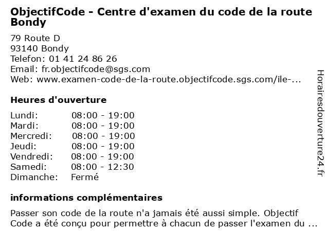 1 ObjectifCode - Centre d'examen du code de la route Bondy (Distance: 0,61 km) 185 Avenue Gallieni, 93140 Bondy bondy, centre, code, d'examen, de, du, la, objectifcode, route 2 La Poste - Centre d'examen du code de la route (Distance: 0,46 km) 2 Avenue Suzanne Buisson, 93140 Bondy centre, centre d'évaluation scolaire, code, d'examen, de, du, la, poste, route, école technique 3 ObjectifCode - Centre d'examen du code de la route Aulnay-sous-Bois (Distance: 1,38 km) 135 Boulevard De Strasbourg, 93600 Aulnay-sous-Bois aulnay, bois, centre, code, d'examen, de, du, la, objectifcode, route, sous 4 La Poste - Centre d'examen du code de la route (Distance: 2,23 km) 1 Rue Pablo Picasso, 93000 Bobigny centre, centre d'évaluation scolaire, code, d'examen, de, du, la, poste, route, école technique 5 ObjectifCode - Centre d'examen du code de la route Livry-Gargan (Distance: 2,84 km) 22 Avenue Vauban, 93190 Livry-Gargan centre, code, d'examen, de, du, gargan, la, livry, objectifcode, route 6 Code'nGO - Centre d’Examen (Distance: 3,00 km) 5 Allée Faidherbe, 93190 Livry-Gargan centre, code, code'ngo, d’examen, examens, permis |