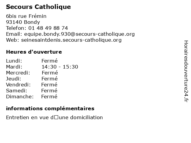 1 Secours Catholique (Distance: 3,27 km) 33 rue Paul-Cavaré, 93110 Rosny-sous-Bois actions, bénévolat, catholique, dons, partage, secours 2 Secours Catholique (Distance: 5,77 km) - Allée Romain Rolland, 93390 Clichy-sous-Bois accueil, association, catholique, organisation, secours 3 Secours Catholique (Distance: 6,10 km) 17 bis Rue de Rosny, 94120 Fontenay-sous-Bois accueil, association, catholique, organisation, secours 4 Secours Catholique (Distance: 8,40 km) 13 rue Saint-Ambroise, 75011 Paris actions, bénévolat, catholique, dons, partage, secours 5 Secours Catholique (Distance: 9,99 km) 11 Rue Marcel Cachin, 95640 Marines accueil, association, catholique, organisation, secours 6 Secours Catholique (Distance: 10,41 km) 1 Allée de Broglie, 95200 Sarcelles accueil, association, catholique, organisation, secours |
