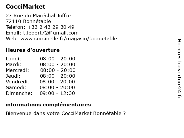 1 CocciMarket (Distance: 9,77 km) 3 Place du Général Leclerc, 72160 Tuffé-Val-de-la-Chéronne alimentation, coccimarket, magasin, superette, supermarché, épicerie 2 CocciMarket (Distance: 17,47 km) 7 Rue Saint-Michel, 72160 Thorigné-sur-Dué alimentation, coccimarket, magasin, superette, supermarché, épicerie 3 Coccinelle Express (Distance: 16,08 km) 39-43 Rue Victor Hugo, 72400 La Ferté-Bernard alimentation, coccinelle, express, magasin, superette, supermarché, épicerie 4 Coccinelle Express (Distance: 16,81 km) 15 Rue Denfert Rochereau, 72400 La Ferté-Bernard alimentation, coccinelle, express, magasin, superette, supermarché, épicerie 5 CocciMarket (Distance: 22,62 km) 9 Rue Louatron, 72170 Beaumont-sur-Sarthe alimentation, coccimarket, magasin, superette, supermarché, épicerie 6 CocciMarket (Distance: 25,02 km) 3 Place de l'Europe, 72650 La Milesse alimentation, bio, coccimarket, courses rapides, fruits et légumes, local, magasin, prix accessibles, produits frais, promotions, proximité, superette, supermarché, épicerie |