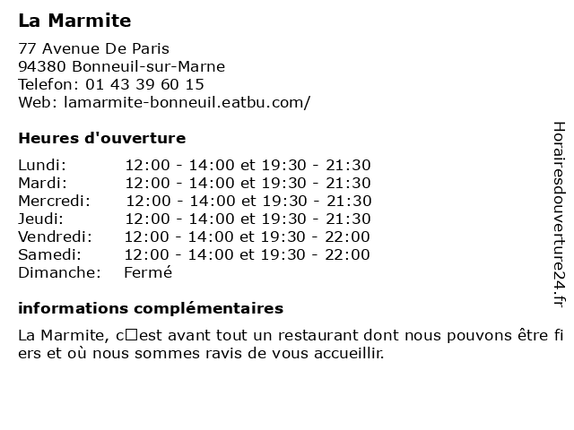 2 La Marmite (Distance: 16,76 km) 5 Avenue Du President Roosevelt, 93300 Aubervilliers marmite, restaurants, staldini 4 L'Art De La Marmite (Distance: 2,54 km) 37 Avenue Carnot, 94100 Saint-Maur-des-Fossés de, l'art, la, marmite 5 Restaurant La Marmite (Distance: 9,53 km) 4 Avenue de Bourgogne, 94150 Rungis bar, bistro, bistrot, brasserie, café, la, marmite, restaurant, restauration 6 La Marmite De Bagnolet (Distance: 9,97 km) La Marmite De Bagnolet, 93170 Bagnolet bagnolet, marmite, restaurants |