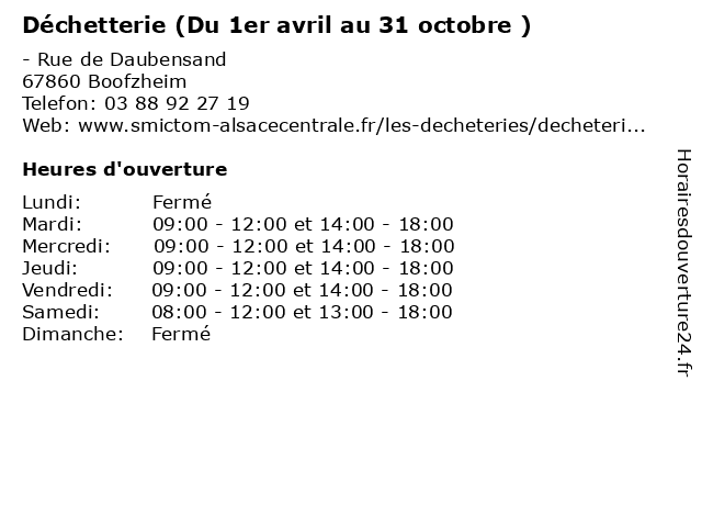 1 Déchetterie (Du 1er avril au 31 octobre ) (Distance: 18,37 km) 20 rue d'Alsace, 67140 Barr 1er, 31, au, avril, decheterie, du, déchetterie, octobre, smictom 2 Déchetterie (Du 1er novembre au 31 mars ) (Distance: 0,00 km) - Rue de Daubensand, 67860 Boofzheim 1er, 31, au, decheterie, du, déchetterie, mars, novembre, smictom 3 Déchetterie (Du 1er novembre au 31 mars) (Distance: 6,31 km) - Route de Herbsheim, 67230 Benfeld 1er, 31, au, decheterie, du, déchetterie, mars, novembre, smictom 4 Déchetterie (Du 1er avril au 31 octobre) (Distance: 6,31 km) - Route de Herbsheim, 67230 Benfeld 1er, 31, au, avril, decheterie, du, déchetterie, octobre, smictom 5 Déchetterie (Du 1er avril au 31 octobre) (Distance: 11,27 km) 17 rue des artisans, 67920 Sundhouse 1er, 31, au, avril, decheterie, du, déchetterie, octobre, smictom 6 Déchetterie (Du 1er novembre au 31 mars) (Distance: 11,27 km) 17 rue des artisans, 67920 Sundhouse 1er, 31, au, decheterie, du, déchetterie, mars, novembre, smictom |