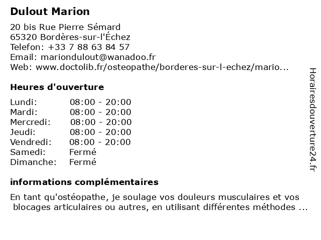 1 Dr Marion Blaizeau - Ophtalmologue (Distance: 4,72 km) 28 Boulevard du 8 Mai 1945, 65000 Tarbes blaizeau, consultation, docteur, dr, marion, med, médecin, médecine, ophtalmologue, traitement 2 Marion Gerbot - Diététicienne (Distance: 9,96 km) 36 Rue des Écoles, 65350 Pouyastruc alimentation, dieteticien, diététicienne, gerbot, marion, nourriture, sante 4 Maylis Dulout - Chiropractrice (Distance: 19,39 km) 1 Place de la République, 65100 Lourdes chiropractrice, chiroprateur, chiropraticien, dulout, maylis, sante, soins 5 Veg' & Table Du Marche a l'Assiette (Distance: 22,82 km) Veg & Table Place Ramon, 65200 Bagneres De Bigorre assiette, cormier, marche, marion, restaurants, table, veg 6 Dr Marion Manileve - Médecin généraliste (Distance: 28,07 km) n/a Route de Lourdes, 64320 Aressy consultation, docteur, dr, généraliste, manileve, marion, med, médecin, médecine, traitement |