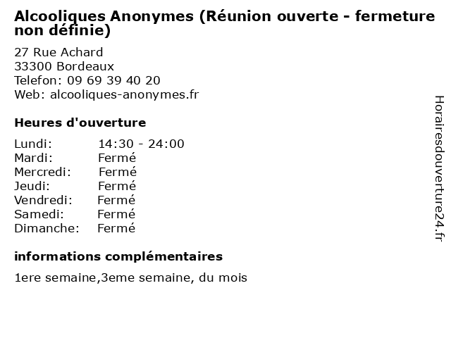Termes de recherche pour Alcooliques Anonymes (Réunion ouverte - fermeture non définie):reunion, non, fermeture, ouverte, alcooliques, anonymes, définie |