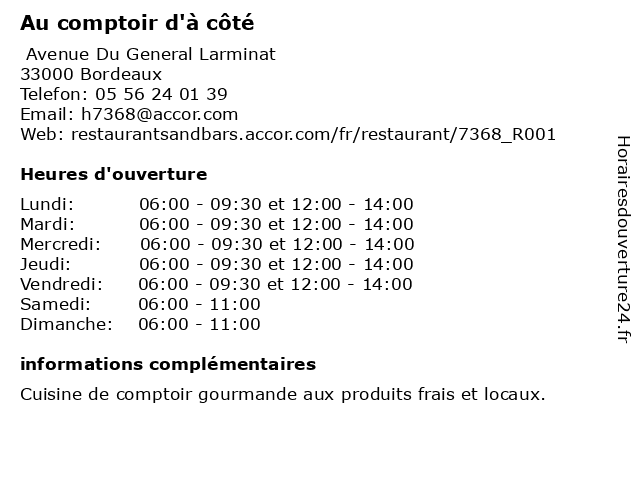 | Lundi | 06:00-09:30 et 12:00-14:00 |