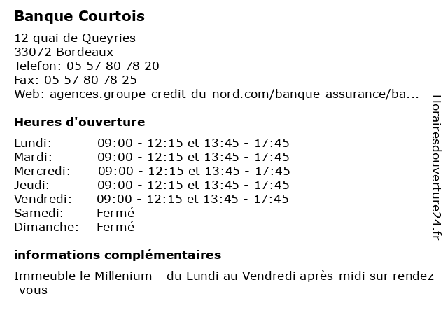 1 Banque Courtois (Distance: 0,87 km) 2 cours du 30 Juillet, 33001 Bordeaux agence, bancaire, banque, courtois 2 Banque Courtois (Distance: 1,39 km) 65 cours Portal, 33000 Bordeaux agence, bancaire, banque, courtois 3 Banque Courtois (Distance: 1,70 km) 116 cours Aristide Briand, 33000 Bordeaux agence, bancaire, banque, courtois 4 Banque Courtois (Distance: 3,71 km) 212-214 avenue de la Libération, 33110 Le Bouscat agence, bancaire, banque, courtois 5 Banque Courtois (Distance: 6,00 km) 492-494 route de Toulouse, 33130 Bègles agence, bancaire, banque, courtois 6 Banque Courtois (Distance: 6,00 km) 492-494 route de Toulouse, 33130 Bègles banque, courtois, crédit, finances, prêt, épargne  |