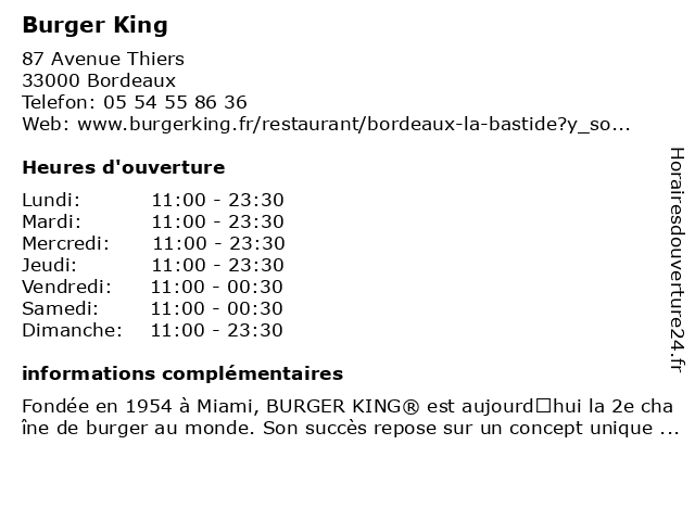 1 Burger King (Distance: 1,55 km) 170 rue sainte catherine, 33000 Bordeaux burger, king, rapide, restaurants 2 Burger King (Distance: 1,90 km) 16 Rue Montesquieu, 33000 Bordeaux bar & gril, burger, king, restaurant américain, restaurant de hamburgers, restaurant familial, restaurant à emporter 3 Burger King (Distance: 3,82 km) n/a Parking du Centre Commercial Auchan, 33300 Bordeaux burger, burgers, drive, et, fast, food, hamburgers, king, rapide, restaurant, restauration, salle 4 Burger King (Distance: 5,55 km) Rue Des Frères Lumière, 33130 Begles bar & gril, burger, king, restaurant américain, restaurant de hamburgers, restaurant familial, restaurant à emporter 5 Burger King (Distance: 5,89 km) 17 Avenue des Frères lumière, 33130 Begles burger, desserts, drive, frites, hamburgers, king, nourriture, rapide, restaurant 6 Burger King (Distance: 9,00 km) 2 Rue Du Signoret, 33560 Sainte Eulalie bar & gril, burger, king, restaurant américain, restaurant de hamburgers, restaurant familial, restaurant à emporter |
