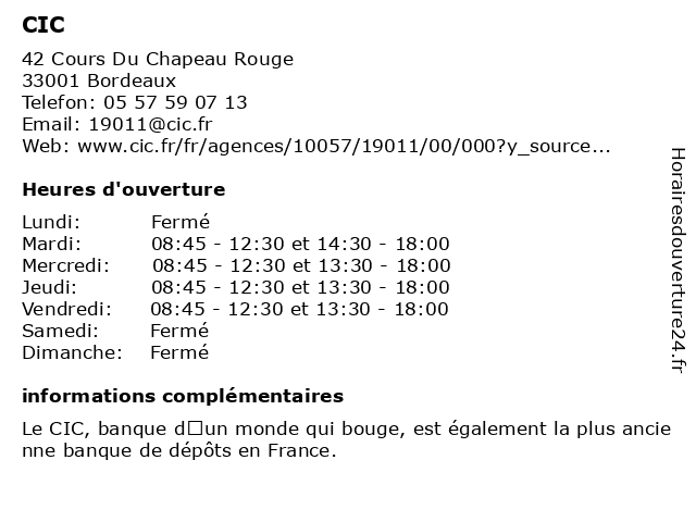 | 1 CIC (Distance: 0,00 km) 42 Cours Du Chapeau Rouge, 33001 Bordeaux cic, compagnie de téléphone, organisme d'assurance 2 CIC (Distance: 0,00 km) 42 Cours Du Chapeau Rouge, 33001 Bordeaux cic, compagnie de téléphone, organisme d'assurance 3 CIC (Distance: 0,01 km) 42 Cours Du Chapeau Rouge, 33000 Bordeaux cic, compagnie de téléphone, organisme d'assurance 4 CIC (Distance: 0,58 km) 21 Place Pey Berland, 33000 Bordeaux cic, compagnie de téléphone, organisme d'assurance 5 CIC (Distance: 0,89 km) 18 Quai Des Chartrons, 33000 Bordeaux cic, compagnie de téléphone, organisme d'assurance 6 CIC (Distance: 0,89 km) 22 Quai des chartrons, 33058 Bordeaux cic, compagnie de téléphone, organisme d'assurance |