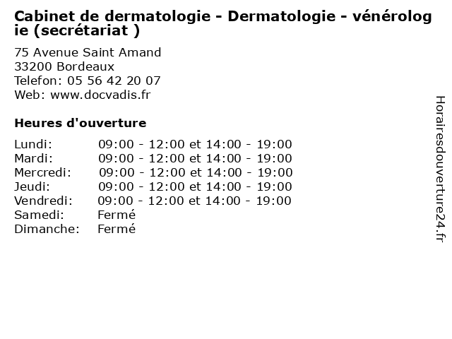 1 Cabinet de dermatologie - Dermatologie - vénérologie (secrétariat ) (Distance: nan km) 75 Avenue Saint Amand, 33200 Bordeaux cabinet, consultation, de, dermatologie, docteur, santé, secrétariat, vénérologie 2 Cabinet de dermatologie - Dermatologie - vénérologie (secrétariat ) (Distance: 3,63 km) 126 Avenue du Médoc, 33320 Eysines cabinet, consultation, de, dermatologie, docteur, santé, secrétariat, vénérologie 3 David Loic Cabinet Dentaire- Dentiste (Distance: 1,42 km) 45 Avenue de la Libération, 33110 Le Bouscat-Bordeaux cabinet, consultation, david, dentaire, dentiste, docteur, loic, santé 4 Cabinet Dentaire Drs Alain Gracia et Jean Philippe PIA (Distance: 1,43 km) 317 Boulevard du Président Wilson, 33200 Bordeaux alain, cabinet, dentaire, dentiste, docteur, drs, et, gracia, jean, philippe, pia 5 Cabinet Dentaire Drs Alain Gracia et Jean Philippe PIA - Horaires du Secrétariat (Distance: 1,43 km) 317 Boulevard du Président Wilson, 33200 Bordeaux alain, cabinet, dentaire, dentiste, docteur, drs, du, et, gracia, horaires, jean, philippe, pia, secrétariat 6 cabinet d'orthodontie- Dentiste (Distance: 2,04 km) 267 rue mandron, 33000 Bordeaux cabinet, consultation, d'orthodontie, dentiste, docteur, santé |