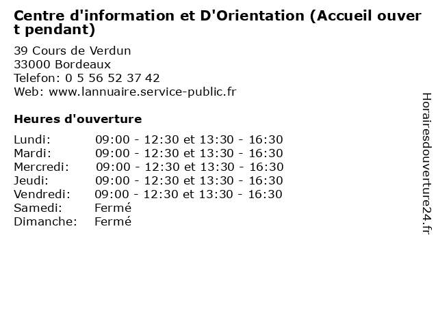 Termes de recherche pour Centre d'information et D'Orientation (Accueil ouvert pendant):et, administration, services, centre, accueil, services publics, ouvert, d'information, pendant, assoc, d'orientation |