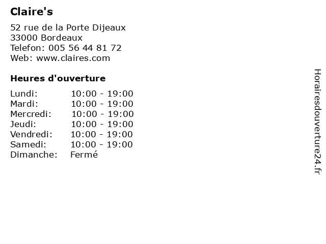 1 Claire's (Distance: 0,48 km) 57 Rue du Château d'Eau, 33000 Bordeaux accessoires, barrettes, claire's, maquillage, sacs, vernis 2 Claire's (Distance: 4,31 km) . Avenue Quarante Journaux, 33300 Bordeaux beaute, cafe, chausures, claire's, enfants, mode femmes, mode hommes, restaurant, sport 3 Claire's (Distance: 5,10 km) . Rue de la Gabarre, 33270 Bouliac accessoires, bijoux, chaussures, claire's, homme, mode femme, restaurant, services 4 Claire's (Distance: 5,41 km) . Chemin de Tartifume, 33130 Bègles accessoires, barrettes, bijoux, claire's, fantaisies, mode, vernis 5 Claire's (Distance: 6,39 km) 17 Avenue de la Somme, 33700 Merignac beaute, bijoux, boutiques, chausseur, claire's, enfants, maison, mode femmes, mode hommes, restaurant, sport 6 Claire's (Distance: 6,60 km) . Rives d'Arcins, 33324 Begles beaute, bijoux, boutiques, chausseur, claire's, enfants, maison, mode femmes, mode hommes, restaurant, sport |