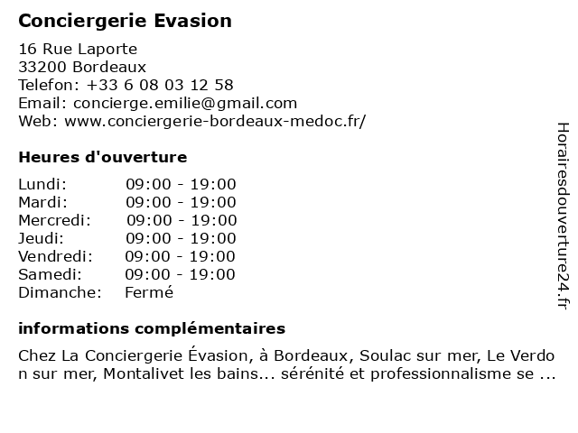 1 Hello Goodbye - Conciergerie 2.0 (Distance: 2,18 km) 3 Rue Pierre Mendès France, 33320 Eysines 2.0, bordeaux, conciergerie, gestion, goodbye, hello, hg, location, service, tourisme, touristique 2 AD CONCIERGERIE - Bassin d'Arcachon (Distance: 2,30 km) 19 Rue Bouguereau, 33000 Bordeaux ad, bassin, conciergerie, d'arcachon 3 Jym Conciergerie (Distance: 2,63 km) 46 Rue du Temps Passe, 33000 Bordeaux bordeaux, conciergerie, gestion, jym, locative, saisonnière, service 4 Conciergerie YouNeedMe (Distance: 3,51 km) 23 Avenue de l´Europe, 33520 Bordeaux bordeaux, conciergerie, privée, you need me, youneedme 5 Cocoonr - Conciergerie (Distance: 4,03 km) 36 rue Borie, 33000 Bordeaux agence, cocoonr, conciergerie, gestion, locative, logements 6 Welkeys Conciergerie (Distance: 4,30 km) 4 Rue du Puits Descazeaux, 33000 Bordeaux bordeaux, conciergerie, gestion, immobilière, location, société, welkeys |
