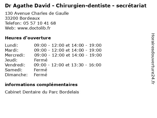 1 David Hybre Architecte (Distance: 0,73 km) 46 Rue de la Dauphine, 33200 Bordeaux amenagement, architecte, architecture, david, décoration, hybre, interieur, maison, paysagiste 2 David Capy Pâtissier (Distance: 0,79 km) 14 Rue de l'Église, 33200 Bordeaux biscuits, capy, chocolats, david, gâteaux, pâtisserie, pâtissier 3 Dr Agathe Sacher - Radiologue (Distance: 0,80 km) 3 Avenue Bel Air, 33200 Bordeaux agathe, consultation, docteur, dr, med, médecin, radiologue, sacher, traitement 4 École élémentaire publique David Johnston (Distance: 1,52 km) 44 Rue David Johnston, 33000 Bordeaux cours, david, education, johnston, publique, services, école, élémentaire 5 Dr Agathe Verdier - Orthodontiste (Distance: 1,53 km) 142 Rue Fondaudège, 33000 Bordeaux agathe, consultation, docteur, dr, med, médecin, orthodontiste, traitement, verdier 6 Maître Agathe de Gromard - Avocate (Distance: 2,14 km) 175 Rue du Jardin Public, 33300 Bordeaux agathe, avocate, avocats, civils, de, droits, gromard, juridiques, maître |