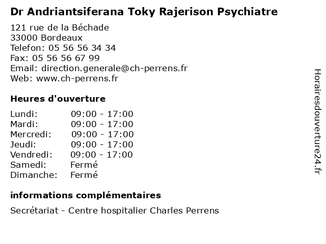 1 Dr Anouck Amestoy Psychiatre (Distance: 0,00 km) 121 rue de la Béchade, 33000 Bordeaux amestoy, anouck, consultation, docteur, dr, med, medecine, medical, médecin, psychiatre, traitement 2 Dr Stéphane Weill - Psychiatre (Distance: 1,63 km) 45 Rue Puységur, 33800 Bordeaux dr, folie, psychiatre, psychiatrie, psychiatrique, stéphane, weill 3 Dr Ana Mouhica - Psychiatre (Distance: 2,23 km) 85 Cours Aristide Briand, 33000 Bordeaux ana, dr, folie, mouhica, psychiatre, psychiatrie, psychiatrique 4 Dr Philippe Royal - Psychiatre (Distance: 2,82 km) 3 Rue Louis Combes, 33000 Bordeaux dr, folie, philippe, psychiatre, psychiatrie, psychiatrique, royal 5 Dr Louis Bacconi - Psychiatre - secrétariat (Distance: 2,91 km) 277 Rue Turenne, 33000 Bordeaux bacconi, consultation, docteur, dr, louis, med, médecin, médecine, psychiatre, secrétariat, traitement 6 Dr Cécile Pelegris - Psychiatre (Distance: 3,18 km) 1 Rue Blanc Dutrouilh, 33000 Bordeaux cécile, dr, folie, pelegris, psychiatre, psychiatrie, psychiatrique |