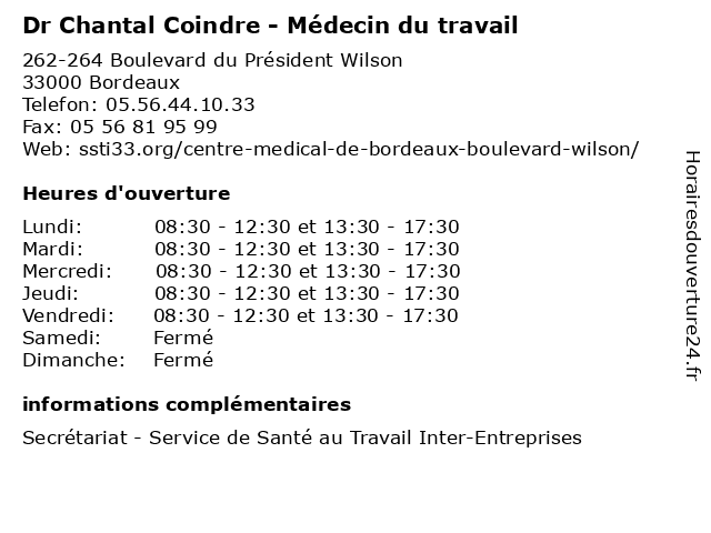 1 SSTI33 - Service de Santé au Travail Inter-Entreprises (Distance: 0,00 km) 262-264 Boulevard du Président Wilson, 33001 Bordeaux au, centre, de, entreprises, famille, inter, médical, santé, service, ssti33, travail 2 Dr Josiane Allio - Médecin du travail (Distance: 0,00 km) 262-264 Boulevard du Président Wilson, 33000 Bordeaux allio, consultation, docteur, dr, du, josiane, med, médecin, traitement, travail 3 Dr Marie-Hélène Bakkali-Hassani - Médecin du travail (Distance: 0,00 km) 262-264 Boulevard du Président Wilson, 33000 Bordeaux bakkali, consultation, docteur, dr, du, hassani, helene, hélène, marie, med, médecin, traitement, travail 4 Dr Guy Fombaron - Médecin du travail (Distance: 0,00 km) 262-264 Boulevard du Président Wilson, 33000 Bordeaux consultation, docteur, dr, du, fombaron, guy, med, médecin, traitement, travail 5 Maître Chantal David - Avocate (Distance: 1,52 km) 42 Cours Georges Clémenceau, 33000 Bordeaux avocate, avocats, chantal, civils, david, droits, juridiques, maître 6 La Soierie Chantal Olivier (Distance: 1,57 km) 54 Cours Georges Clemenceau, 33000 Bordeaux chantal, cocktail, collections, entreprise, la, mariage, mariée, olivier, robes, société, soierie |