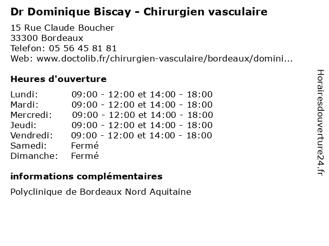 Termes de recherche pour Dr Dominique Biscay - Chirurgien vasculaire:du, horaires, cabinet, services, santé, dominique, docteur, médecin, biscay, dr, chirurgien, vasculaire |