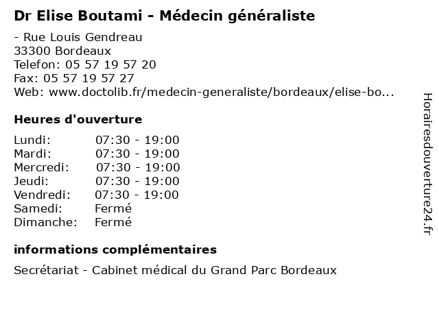 1 Dr Elise de Roquefeuil Durandeau - Radiologue - secretariat (Distance: 0,48 km) 15 Rue Claude Boucher, 33300 Bordeaux de, dr, durandeau, elise, médecin, médecine, médical, pharmaceutique, radiologue, roquefeuil, secretariat, traitement 2 Dr Caroline Boutami Lassalle Saint Jean - Radiologue (Distance: 0,54 km) 15 à 35 rue Claude Boucher, 33300 Bordeaux aquitaine, bordeaux, boutami, caroline, diagnostique, dr, imagerie, jean, lassalle, nord, polyclinique, radiologie, radiologue, saint, thérapeutique 3 Dr Caroline Boutami - Angiologue (Distance: 2,13 km) 311 Avenue de la Libération Charles de Gaulle, 33110 Le Bouscat angiologue, boutami, caroline, consultation, docteur, dr, med, médecin, traitement 4 Cabinet Infirmier Elise Dalier (Distance: 2,34 km) 79 Rue de Marseille, 33000 Bordeaux cabinet, dalier, elise, infirmier 5 Maître Jeanne-Elise Mouillac - Avocate (Distance: 2,41 km) 45 rue Vital Carles, 33000 Bordeaux avocate, avocats, civils, droits, elise, jeanne, juridiques, maître, mouillac 6 Elise Atlantique (Distance: 3,14 km) 65 quai de Brazza, 33100 Bordeaux atlantique, déchets, elise, entreprise, recyclage |