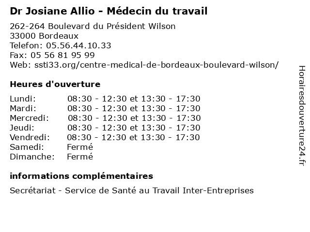 1 SSTI33 - Service de Santé au Travail Inter-Entreprises (Distance: 0,00 km) 262-264 Boulevard du Président Wilson, 33001 Bordeaux au, centre, de, entreprises, famille, inter, médical, santé, service, ssti33, travail 2 Dr Marie-Hélène Bakkali-Hassani - Médecin du travail (Distance: 0,00 km) 262-264 Boulevard du Président Wilson, 33000 Bordeaux bakkali, consultation, docteur, dr, du, hassani, helene, hélène, marie, med, médecin, traitement, travail 3 Dr Chantal Coindre - Médecin du travail (Distance: 0,00 km) 262-264 Boulevard du Président Wilson, 33000 Bordeaux chantal, coindre, consultation, docteur, dr, du, med, médecin, traitement, travail 4 AHI 33 - Service de Santé au Travail (Distance: 2,14 km) 6 Quai Louis XVIII, 33000 Bordeaux 33, ahi, au, centre, de, famille, santé, service, travail 5 AHI 33 - Service de Santé au Travail (Distance: 3,37 km) 5 Rue Théodore Blanc, 33520 Bruges 33, ahi, au, centre, de, famille, santé, service, travail 6 AHI 33 - Service de Santé au Travail (Distance: 4,19 km) 6 Rue Achard, 33000 Bordeaux 33, ahi, au, centre, de, famille, santé, service, travail |
