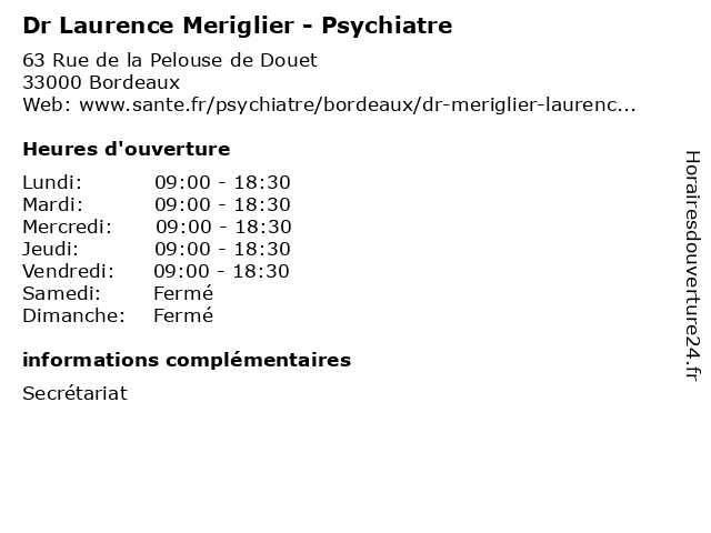 1 Dr Laurence Joly Pédiatre (Distance: 0,32 km) - Place Amélie Raba Léon, 33000 Bordeaux consultation, docteur, dr, joly, laurence, med, médecin, pédiatre, traitement 3 BORDENAVE Laurence (Distance: 0,34 km) Rue Docteur Hoffmann Martinot, 33076 Bordeaux bordenave, laurence 4 Dr Anouck Amestoy Psychiatre (Distance: 0,85 km) 121 rue de la Béchade, 33000 Bordeaux amestoy, anouck, consultation, docteur, dr, med, medecine, medical, médecin, psychiatre, traitement 5 Dr Kelly Guichard - Psychiatre (Distance: 1,02 km) 138 Avenue de la République, 33000 Bordeaux dr, folie, guichard, kelly, psychiatre, psychiatrie, psychiatrique 6 Dr Florence Baché-Fénelon - Psychiatre (Distance: 1,02 km) 18 Rue Verte, 33000 Bordeaux baché, dr, florence, folie, fénelon, psychiatre, psychiatrie, psychiatrique |