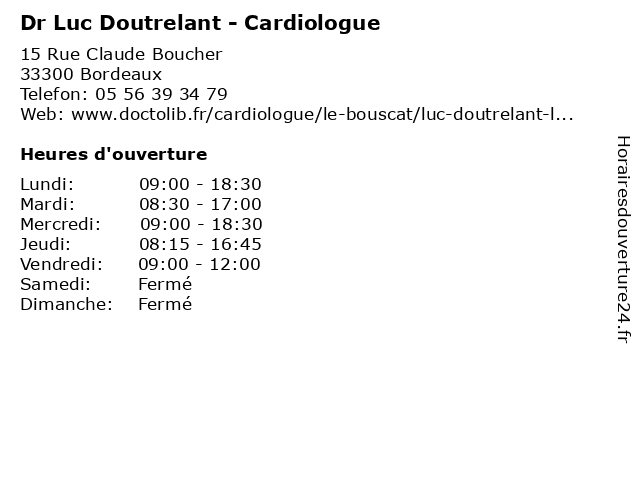 1 Dr Luc Corneloup - Cardiologue (Distance: 0,00 km) 15 Rue Claude Boucher, 33300 Bordeaux cardiologue, consultation, corneloup, docteur, dr, luc, med, médecin, traitement 2 Dr Bruno Fischer - Cardiologue - secrétariat (Distance: 0,08 km) 35 Rue Claude Boucher, 33300 Bordeaux bruno, cardiologue, dr, fischer, médecins, médicaments, santé, secrétariat, spécialiste 3 Dr François Casteigt - Cardiologue (Distance: 0,08 km) 15 à 35 rue Claude Boucher, 33300 Bordeaux aquitaine, bordeaux, cardio, cardiologie, cardiologue, casteigt, coeur, dr, françois, nord, polyclinique 4 Dr Guillaume Flory - Cardiologue (Distance: 0,08 km) 15 à 35 rue Claude Boucher, 33300 Bordeaux aquitaine, bordeaux, cardio, cardiologie, cardiologue, coeur, dr, flory, guillaume, nord, polyclinique 5 Dr Laurent Gencel - Cardiologue (Distance: 0,08 km) 15 à 35 rue Claude Boucher, 33300 Bordeaux aquitaine, bordeaux, cardio, cardiologie, cardiologue, coeur, dr, gencel, laurent, nord, polyclinique 6 Dr Romain Girardot - Cardiologue (Distance: 0,08 km) 15 à 35 rue Claude Boucher, 33300 Bordeaux aquitaine, bordeaux, cardio, cardiologie, cardiologue, coeur, dr, girardot, nord, polyclinique, romain |