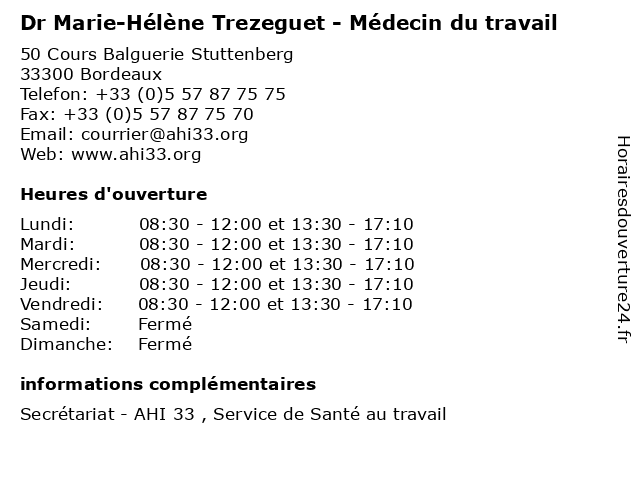 1 Dr Agnès Scotto Di Vettimo-Pralain - Médecin du travail (Distance: 0,00 km) 50 Cours Balguerie Stuttenberg, 33300 Bordeaux agnes, agnès, consultation, di, docteur, dr, du, med, médecin, pralain, scotto, traitement, travail, vettimo 2 Dr Christine Muller - Médecin du travail (Distance: 0,00 km) 50 Cours Balguerie Stuttenberg, 33300 Bordeaux christine, consultation, docteur, dr, du, med, muller, médecin, traitement, travail 3 Dr Marion Dardevet - Médecin du travail (Distance: 0,00 km) 50 Cours Balguerie Stuttenberg, 33300 Bordeaux consultation, dardevet, docteur, dr, du, marion, med, médecin, traitement, travail 4 Dr Catherine Cornuault-Eresue - Médecin du travail (Distance: 0,00 km) 50 Cours Balguerie Stuttenberg, 33300 Bordeaux catherine, consultation, cornuault, docteur, dr, du, eresue, med, médecin, traitement, travail 5 Dr Jocelyne Ayella - Médecin du travail (Distance: 0,00 km) 50 Cours Balguerie Stuttenberg, 33300 Bordeaux ayella, consultation, docteur, dr, du, jocelyne, med, médecin, traitement, travail 6 AHI 33 - Service de Santé au Travail (Distance: 1,39 km) 6 Quai Louis XVIII, 33000 Bordeaux 33, ahi, au, centre, de, famille, santé, service, travail |