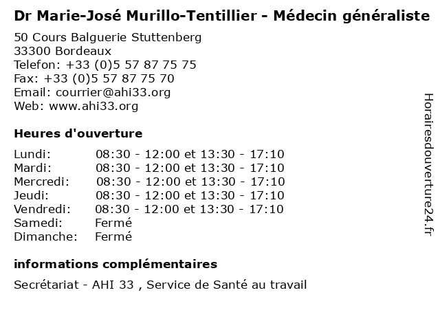 1 Dr Marie-José Faye - Médecin du travail (Distance: 0,00 km) 50 Cours Balguerie Stuttenberg, 33300 Bordeaux consultation, docteur, dr, du, faye, jose, josé, marie, med, médecin, traitement, travail 2 José Da Cunha (Distance: 0,30 km) 63 cours Portal, 33000 Bordeaux accessoires, boutique, cocktail, cunha, da, josé, mariage, mariée, robes 3 Marie-José Chong - Sage-femme (Distance: 1,13 km) 15 Rue Claude Boucher, 33300 Bordeaux chong, consultation, docteur, dr, femme, jose, josé, marie, med, médecin, sage, traitement 4 Maître Marie-José Léglise - Avocate (Distance: 1,88 km) 18 rue Vital Carles, 33000 Bordeaux avocate, avocats, civils, droits, josé, juridiques, léglise, marie, maître 5 Maître Marie-José Malo - Avocate (Distance: 1,97 km) 26 Place des Martyrs de la Résistance, 33000 Bordeaux avocate, avocats, civils, droits, josé, juridiques, malo, marie, maître 6 Cabinet dentaire des Drs José NORIEGA et Victoria ICHANE (Distance: 2,00 km) 23 Place des Martyrs de la Résistance, 33000 Bordeaux cabinet, dentaire, dentiste, des, docteur, drs, et, ichane, josé, noriega, victoria |