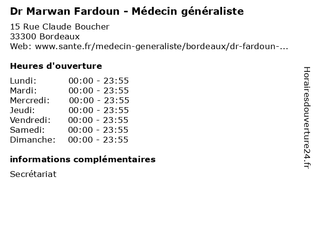 1 Dr Fardoun Marwan - Urgentiste (Distance: 45,08 km) 14 Boulevard Javal, 33740 Arès dr, fardoun, marwan, médecin, médecine, médical, pharmaceutique, secrétariat, traitement, urgentiste 2 Dr Sabina Aouni - Médecin généraliste (Distance: 0,05 km) 15 à 35 rue Claude Boucher, 33300 Bordeaux aouni, aquitaine, bordeaux, dr, généraliste, medecin, médecin, nord, polyclinique, sabina, soins, urgence, urgentiste 3 Dr Julien Boichut - Médecin généraliste (Distance: 0,08 km) 15 à 35 rue Claude Boucher, 33300 Bordeaux aquitaine, boichut, bordeaux, dr, généraliste, julien, medecin, médecin, nord, polyclinique, soins, urgence, urgentiste 4 Dr Bruno Boutet - Médecin généraliste (Distance: 0,08 km) 15 à 35 rue Claude Boucher, 33300 Bordeaux aquitaine, bordeaux, boutet, bruno, dr, généraliste, medecin, médecin, nord, polyclinique, soins, urgence, urgentiste 5 Dr Jerôme Brasseur - Médecin généraliste (Distance: 0,67 km) 69 Rue Frédéric Bentayoux, 33300 Bordeaux brasseur, docteur, dr, generaliste, généraliste, jerôme, medical, médecin, soin 6 Dr Samir Bouhenika - Médecin généraliste (Distance: 0,82 km) 5 Avenue Gauthier Lagardère, 33110 Le Bouscat bouhenika, dr, généraliste, médecin, médecine, médical, pharmaceutique, samir, traitement |