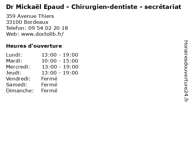 1 Dr Mickaël Epaud - Dentiste (Distance: 0,03 km) 359 Avenue Thiers, 33100 Bordeaux care, clinic, dentist, dentiste, dermatologue, dr, epaud, france, gynécologue, health, kinesitherapeute, mickaël, ophtalmologiste, orl, psychologue, service 5 Mickaël Lobre - Ostéopathe (Distance: 25,58 km) 10 Rue de la Gendarmerie, 33760 Targon lobre, mickaël, osteo, osteopathe, ostéopathe, sante, soins 6 |