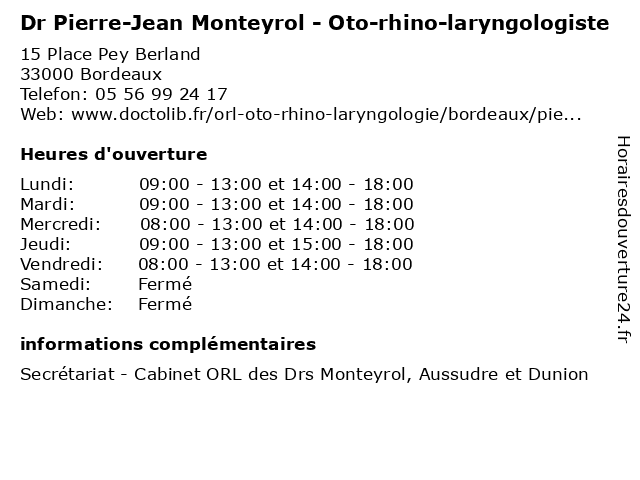 1 Dr Dorothée Dunion - Oto-rhino-laryngologiste (Distance: 0,00 km) 15 Place Pey Berland, 33000 Bordeaux consultation, docteur, dorothée, dr, dunion, laryngologiste, med, médecin, médecine, oto, rhino, secrétariat, traitement 2 Maître Emilie Monteyrol - Avocate (Distance: 0,13 km) 10 Place Pey-Berland, 33000 Bordeaux avocate, avocats, civils, droits, emilie, juridiques, maître, monteyrol 3 Oto Disques (Distance: 0,34 km) 24 Rue Ravez, 33000 Bordeaux acid, ambient, boutique de disques, disco, disques, experimental, house, industriel, oto, synth, techno, wave 4 Dr Valérie Vidal - Oto-Rhino-Laryngologue (Distance: 2,27 km) - Place Amélie Raba Léon, 33000 Bordeaux dr, laryngologie, laryngologue, orl, oto, rhino, valerie, valérie, vidal 5 Dr Sophie Zago - Oto-rhino-laryngologie - secrétariat (Distance: 2,30 km) 220 Rue Mandron, 33300 Bordeaux dr, laryngologie, médecin, médecine, médical, oto, pharmaceutique, rhino, secrétariat, sophie, traitement, zago 6 Dr Vincent Remy - Oto-rhino-laryngologie - Chirurgien de la face et du cou - secrétariat (Distance: 2,30 km) 220 Rue Mandron, 33300 Bordeaux chirurgien, cou, de, dr, du, et, face, la, laryngologie, médecin, médecine, médical, oto, pharmaceutique, remy, rhino, secrétariat, traitement, vincent |