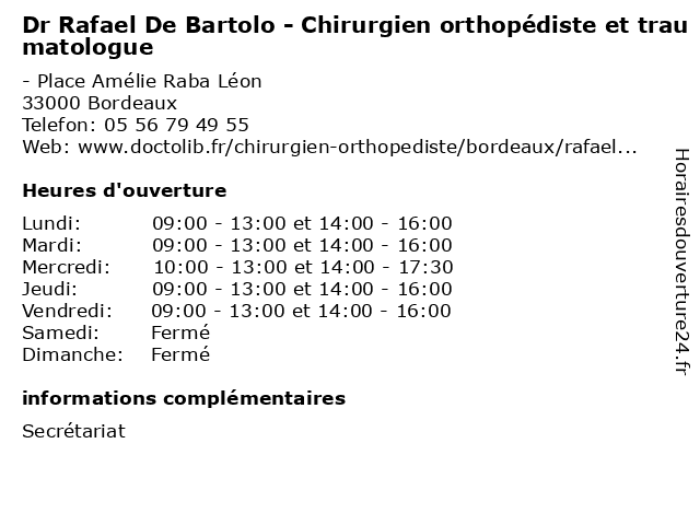 1 Dr Vincent Souillac - Chirurgien orthopédiste et traumatologue (Distance: 0,00 km) - Place Amélie Raba Léon, 33000 Bordeaux chirurgien, dr, et, orthopedie, orthopédique, orthopédiste, souillac, trauma, traumatologie, traumatologique, traumatologue, vincent 2 Dr Thibaut Noailles - Chirurgien orthopédiste et traumatologue (Distance: 1,02 km) 138 Avenue de la République, 33200 Bordeaux chirurgien, dr, et, medecin, noailles, ortho, orthoptiste, orthopédiste, sante, thibaut, traumatologue 3 Dr Laurent Balabaud - Chirurgien orthopédiste et traumatologue (Distance: 1,02 km) 138 Avenue de la République, 33200 Bordeaux balabaud, chirurgien, consultation, docteur, dr, et, laurent, med, médecin, orthopédiste, traitement, traumatologue 4 Dr Jérémie Knafo - Chirurgien orthopédiste et traumatologue (Distance: 1,02 km) 138 Avenue de la République, 33200 Bordeaux chirurgien, consultation, docteur, dr, et, jérémie, knafo, med, médecin, orthopédiste, traitement, traumatologue 5 Medecin Nicolas Pommier (Chirurgien orthopédiste et traumatologue) (Distance: 1,03 km) 7 Rue Pierre-Loti, 33200 Bordeaux chirurgien, docteur, et, medecin, nicolas, orthopédiste, pommier, sante, services, traumatologue 6 Medecin Eric Toullec (Chirurgien orthopédiste et traumatologue) (Distance: 1,21 km) 151 Rue du Tondu, 33000 Bordeaux chirurgien, docteur, eric, et, medecin, orthopédiste, sante, services, toullec, traumatologue |