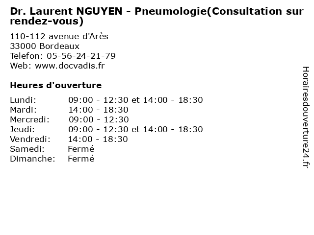 1 Dr. Laurent NGUYEN - Pneumologie (Autre) (Distance: 0,00 km) 110-112 avenue d'Arès, 33000 Bordeaux autre, consultation, docteur, dr., laurent, nguyen, pneumologie, santé 2 Pham Nguyen Thi Kim Tuyen (Distance: 1,85 km) 159 Rue Fondaudege, 33000 Bordeaux kim, nguyen, pham, restaurants, thi, tuyen 4 5 Dr Alexandre Nguyen Huu - Médecin généraliste (Distance: 3,17 km) 21 Rue Jardel, 33100 Bordeaux alexandre, consultations, docteur, dr, généraliste, huu, médecin, médical, nguyen 6 Dr Estelle Mousset-Nguyen - Médecin du travail (Distance: 3,20 km) 50 Cours Balguerie Stuttenberg, 33300 Bordeaux consultation, docteur, dr, du, estelle, med, mousset, médecin, nguyen, traitement, travail |