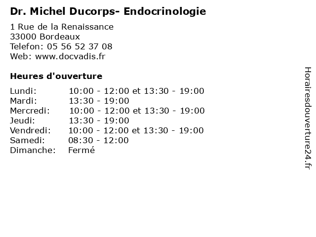 1 Cabinet du Docteur Michel Ducorps - Endocrinologie (secrétariat ) (Distance: 0,00 km) 1 Rue de la Renaissance, 33000 Bordeaux cabinet, consultation, docteur, du, ducorps, endocrinologie, michel, santé, secrétariat 2 Chez Ambre & Michel (Distance: 0,89 km) 1 rue Matignon, 33000 Bordeaux ambre, bistrot, chez, michel, restaurant 3 Justin Michel - Masseur-kinésithérapeute - secrétariat (Distance: 1,64 km) 27B Cours de Verdun, 33000 Bordeaux docteur, justin, kinésithérapeute, masseur, michel, médecin, médecine, secrétariat 4 Les Jardins de Bordeaux - Parc des Sports Saint-Michel (16/10-31/03) (Distance: 2,64 km) . Quais des Salinières, 33000 Bordeaux 16/10, 31/03, bordeaux, de, des, jardin, jardins, les, mairie, michel, parc, saint, services, sports 5 Les Jardins de Bordeaux - Parc des Sports Saint-Michel (01/01-15/07) (Distance: 2,64 km) . Quais des Salinières, 33000 Bordeaux 01/01, 15/07, bordeaux, de, des, jardin, jardins, les, mairie, michel, parc, saint, services, sports 6 Les Jardins de Bordeaux - Parc des Sports Saint-Michel (16/07-15/09) (Distance: 2,64 km) . Quais des Salinières, 33000 Bordeaux 15/09, 16/07, bordeaux, de, des, jardin, jardins, les, mairie, michel, parc, saint, services, sports |