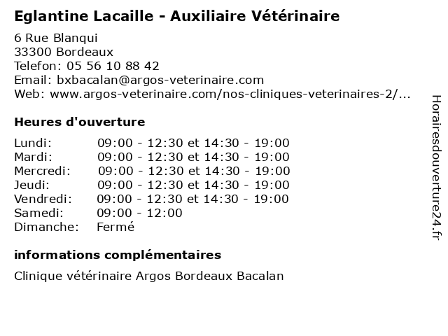 1 Maryline Michou - Auxiliaire Vétérinaire (Distance: 0,00 km) 6 Rue Blanqui, 33300 Bordeaux animaux, auxiliaire, clinique, dr, maryline, michou, médical, santé, soins, vétérinaire 2 Argos Vétérinaire (Distance: 0,06 km) 6 rue Blanqui, 33300 Bordeaux argos, clinique vétérinaire, soins vétérinaires, vétérinaire 3 Clinique Vétérinaire Urbiveto (Distance: 2,26 km) 95 rue du Jardin Public, 33000 Bordeaux clinique, medicales, services, urbiveto, veterinaires, vétérinaire 4 Clinique Vétérinaire du Jardin Public (Distance: 2,26 km) 95 rue du jardin public, 33000 Bordeaux clinique, cliniques, du, jardin, medicales, oveto, public, veterinaires, veterinaires.services, vétérinaire 5 Manon Piet - Auxiliaire Vétérinaire (Distance: 2,67 km) 63 Avenue Thiers, 33100 Bordeaux animaux, auxiliaire, clinique, manon, médical, piet, santé, soins, vétérinaire 6 Manon Potier - Auxiliaire Vétérinaire (Distance: 2,67 km) 63 Avenue Thiers, 33100 Bordeaux animaux, auxiliaire, clinique, manon, médical, potier, santé, soins, vétérinaire |