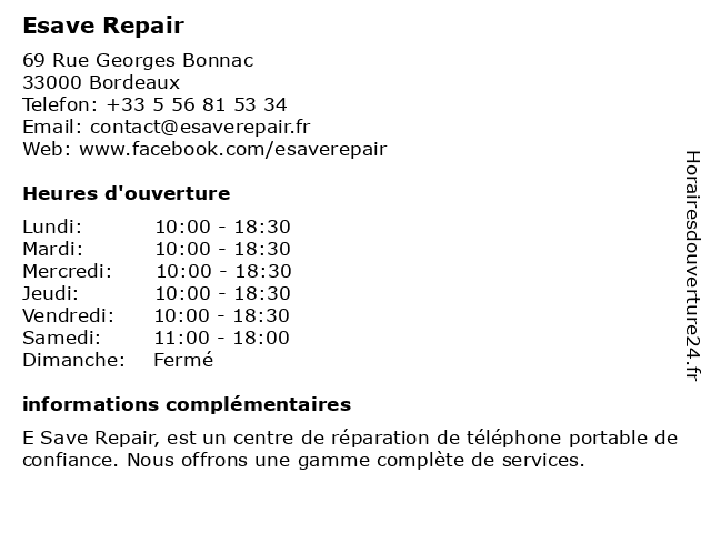 1 Esave Repair (Distance: 0,25 km) 29 Rue du Docteur Charles Nancel Penard, 33000 Bordeaux esave, repair 2 Repair Express Bordeaux (Distance: 0,25 km) 29 rue Dr Charles nancel penard, 33000 Bordeaux bordeaux, express, phone, repair, reparations, telephone 3 Repair and Run - Bordeaux Centre (Distance: 1,06 km) 10 Cours du Chapeau-Rouge, 33000 Bordeaux and, atelier, bordeaux, centre, repair, run, réparation, trottinettes, vélos 4 Repair Old Phone (Distance: 1,21 km) 7 Boulevard du Président Wilson, 33200 Bordeaux abonnement pas chere, accessoires pour téléphone, accessoires voiture, batterie externe, coque de téléphone, coriolis, ecran cassé, film hydrogel, lycamobile, old, phone, point relais, remplacement d'ecran iphone, remplacement de batterie, repair, reparateur de telephone, reparation samsung, ria, réparation, réparation de telephone 5 Docteur Ordinateur (Distance: 0,14 km) 65 Rue Judaïque, 33000 Bordeaux assistance, computer repair, docteur, maintenance, ordinateur, personal services 6 WeFix (Distance: 4,48 km) n/a Avenue des 40 journaux, 33000 Bordeaux repair, service, smartphone, tablette, wefix |