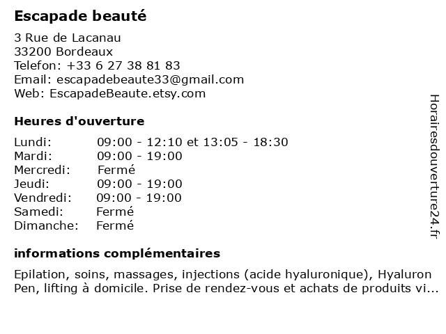 2 L'Escapade (Distance: 1,02 km) 299 Avenue d'Arès, 33200 Bordeaux alimentation, brasserie, l'escapade, parking, restaurant, terrasse 4 Caprice Beauté (Distance: 2,12 km) 489 Avenue Maréchal De Lattre De Tassigny, 33000 Bordeaux beauté, caprice, institut 5 Epilea - Centre de Beauté (Distance: 2,61 km) 14 Rue Judaïque, 33000 Bordeaux beauty, beauté, business, centre, de, epilea, nails, salon, spa 6 Chère Amie - Institut de Beauté (Distance: 3,03 km) 15bis Cours de Maréchal Foch, 33000 Bordeaux amie, beauté, béaute, chère, cosmétiques, de, institut, maquillage, peau, personnels, salon, soins |