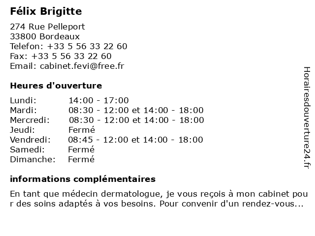 1 Metbach Zachari Félix (Distance: 0,85 km) 91 Rue de la République, 33400 Talence félix, metbach, zachari 2 Brigitte Benayoun - Hypnothérapeute (Distance: 1,27 km) 84 Rue Pierre Renaudel, 33130 Bègles benayoun, brigitte, hypnose, hypnotherapeute, hypnothérapeute, sante, soins 3 Dr Brigitte Tandonnet - Gynécologue médicale (Distance: 1,73 km) 45 Cours Marechal Gallieni, 33000 Bordeaux brigitte, consultation, docteur, dr, gynécologue, med, médecin, médicale, tandonnet, traitement 4 Maître Brigitte Chemin-Dufranc - Avocate (Distance: 2,08 km) 22 rue Elisée Reclus, 33000 Bordeaux avocate, avocats, brigitte, chemin, civils, droits, dufranc, juridiques, maître 5 Bijou Brigitte (Distance: 2,09 km) 98 Rue Sainte-Catherine, 33000 Bordeaux accessoires, bijou, bijouterie, bijoux, brigitte, cadeaux, fantaisie 6 Dr Brigitte Drouet - Médecin généraliste (Distance: 3,56 km) - Rue de la Course, 33000 Bordeaux brigitte, consultation, docteur, dr, drouet, généraliste, med, médecin, traitement |