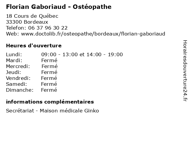 1 M. Florian Tremel - Ostéopathe (Distance: 2,55 km) 215 Avenue du Président Robert Schuman, 33110 Le Bouscat cabinet, de, ermitage, florian, m., ostéo, ostéopathe, ostéopathes, santé, soins, tremel 2 Aleyrangue Florian Thierry (Distance: 3,50 km) 15 Rue Peyreblanque, 33000 Bordeaux aleyrangue, florian, restaurants, thierry 3 Manzini Florian (Distance: 3,53 km) 10 Place Charles Gruet, 33000 Bordeaux florian, manzini, restaurants 4 Dr Florian Dechaine - Médecin généraliste (Distance: 3,83 km) 96 Rue Abbé de l'Épée, 33000 Bordeaux dechaine, docteur, dr, florian, generaliste, généraliste, medical, médecin, soin 5 Desestre Florian (Distance: 4,11 km) 18 Rue Du Parlement Saint Pierre, 33000 Bordeaux desestre, florian, restaurants 6 Voize Florian (Distance: 5,12 km) 15 Petite Rue De Saintonge, 33000 Bordeaux florian, restaurants, voize |