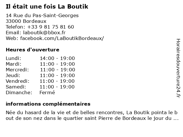1 Frip' Confit Boutik (Distance: 0,06 km) 36 Rue du Cancera, 33000 Bordeaux boutik, boutique, confit, dépôt, frip', friperie, vente, vêtements 3 Autour d'Une Crepe (Distance: 0,14 km) Autour d Une Crepe, 38470 Chantesse autour, christian, crepe, leger, philippe, restaurants 5 Il Etait une Fois... (Distance: 0,53 km) 176 Rue Sainte Catherine, 33000 Bordeaux cassette, etait, film, fois..., il, numérisation, sauvegarde, super8, une 6 Boutik Castel (Distance: 1,02 km) 75 Rue Georges Bonnac, 33000 Bordeaux alimentation, bio, boutik, castel, vrac, épicerie |
